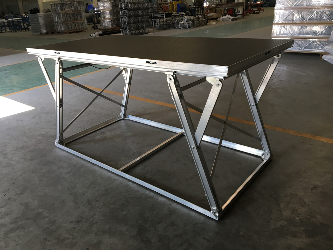 手动升降舞台具有操作方便、搭建快捷、任意组合、收拢后高度低、外形美观、承载能力大等特点,适用于在室内或室外搭建组合舞台。