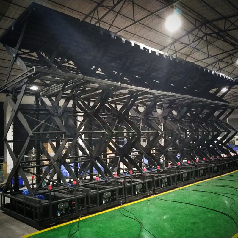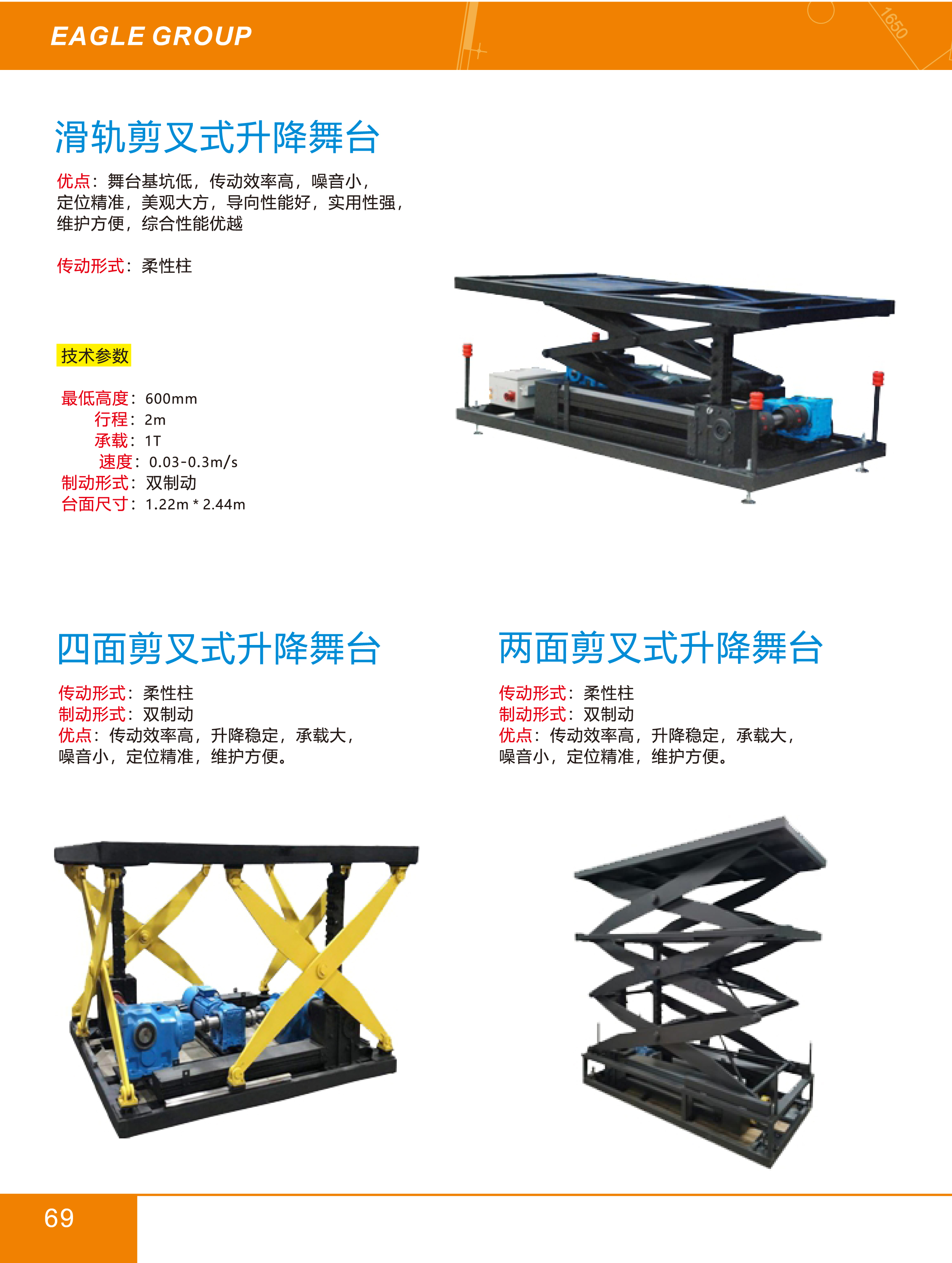优点:两面剪叉式升降舞台结构适用于较窄舞台面的升降台使用,具有行程大、运行平稳、定位精准和运输方便等特点。